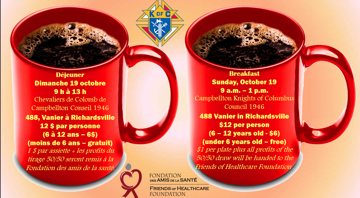 Mark this on your calendar for the Breakfast fundraiser on October 19th from 9am till 1pm at the Knights of Columbus Council 1946 at 488 Vanier street in Richardsville