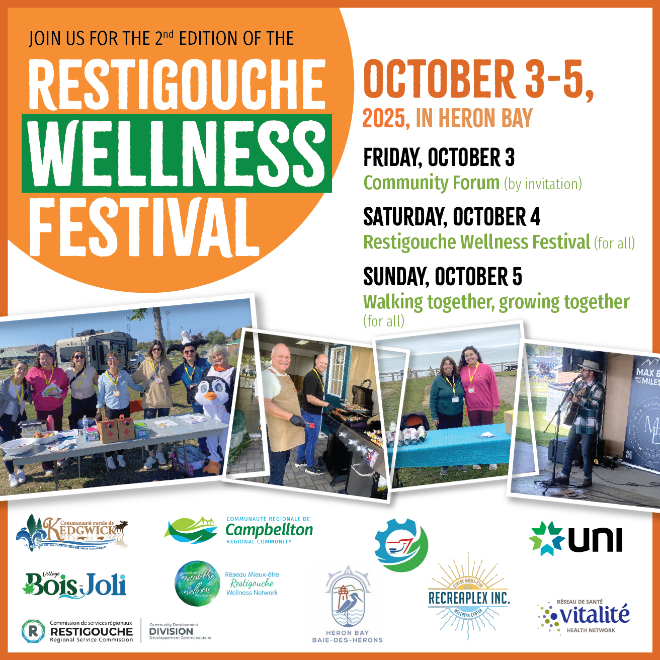 The Restigouche wellness Festival takes place in Heron Bay on Friday October3, 4th and 5th. Friday is the Community Forum (by invitation) and Saturday is the Restigouche Wellness Festival and then on Sunday Enjoy walking together and growing together.