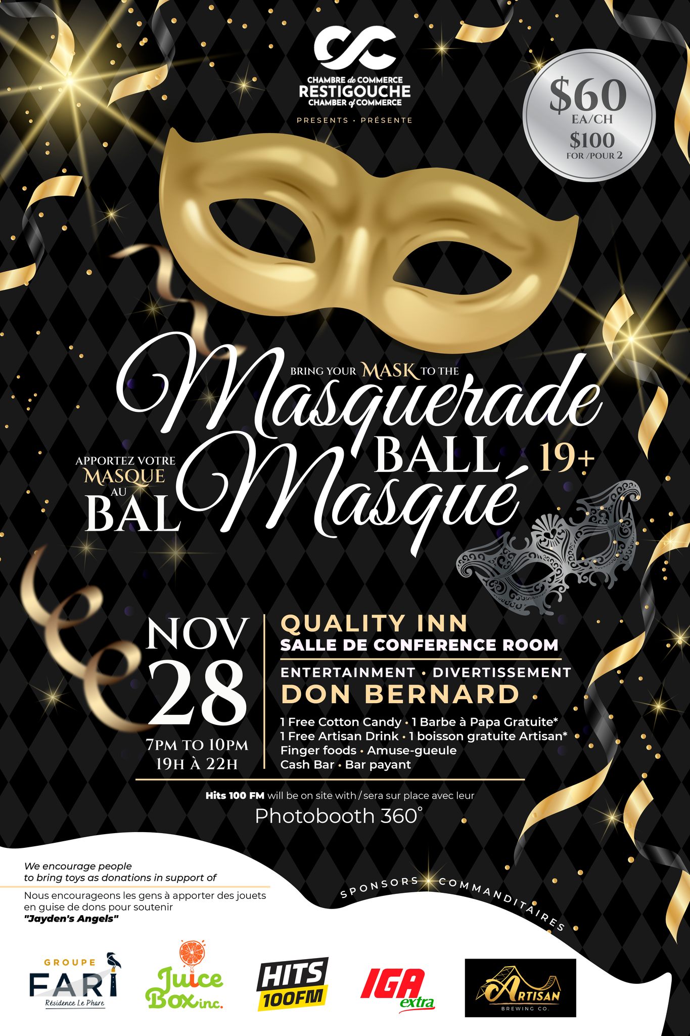 BIG NEWS!!! 1st Annual Silver & Gold Masquerade Ball! Join us for an unforgettable evening hosted by the Restigouche Chamber of Commerce! Friday, November 28th Quality Hotel Conference Room 7:00 PM – 10:00 PM Tickets: $60 each or 2 for $100 Includes: 1 free cotton candy, 1 complimentary "Artisan" drink, and finger foods! Semi-formal attire | Masks are a must! Prizes for Most Creative Mask & Most Elegant Mask — so get fancy and have fun!…