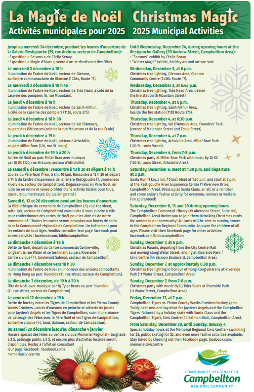 The Campbellton Regional Community invites everyone to join us for our upcoming Christmas festivities! Take part in the community lightings, enjoy the small gatherings that follow, and don’t miss our Christmas parade. For complete details on dates, times, and locations, please see the poster below or the attached file. Come celebrate the magic of the season with us and share in the community spirit! 🎄✨