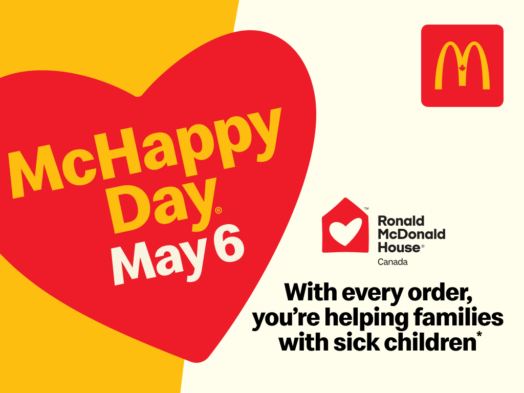Mark your calendars! McHappy Day is coming back on Wednesday, May 6. On McHappy Day, your order is more than a meal, it’s a chance to give back! McDonald's Canada and its local, independent franchisees will be donating a portion of the proceeds from all food and beverage menu items on May 6th towards Ronald McDonald House and other local children’s charities. The funds raised on McHappy Day provide critical support for tens of thousands of families staying at Ronald…